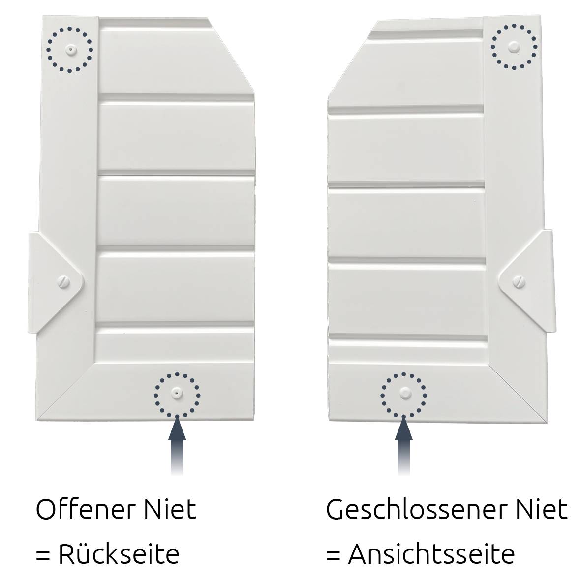 Das Foto zeigt Vorder- und Rückseite eines Elements. Die sichtbare Seite ist geschlossen, sauber vernietet – für eine ruhige Optik. Auf der Rückseite ist die offene Nietverbindung erkennbar. Ein technisches Detail, das für Stabilität sorgt – ohne die Ansicht zu stören.