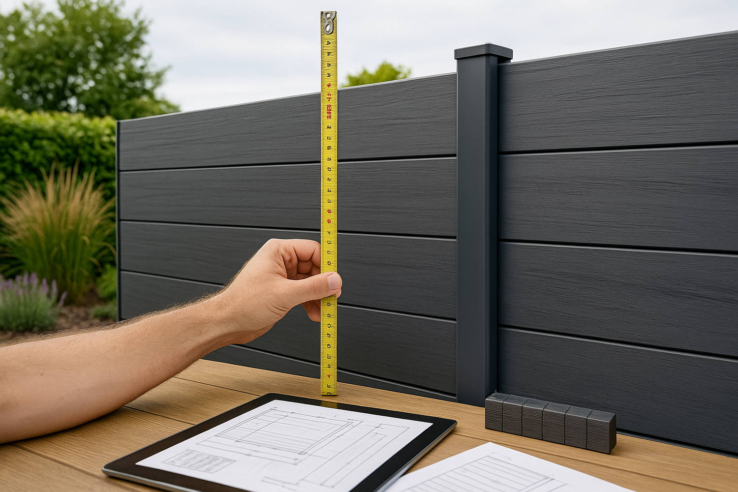 Miss genau aus, wie lang und hoch Dein Sichtschutz sein soll. Gängige Höhen sind 90, 120, 150 oder 180 cm. Beachte gesetzliche Regelungen zu Grundstücksgrenzen und Höhe.