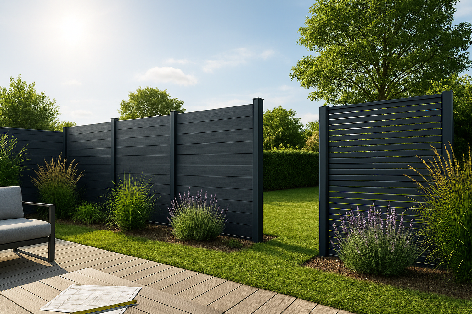 | Blickdichter Sichtschutz | WPC oder PVC mit 180 cm Höhe | Designprofile auf Wunsch ergänzen |