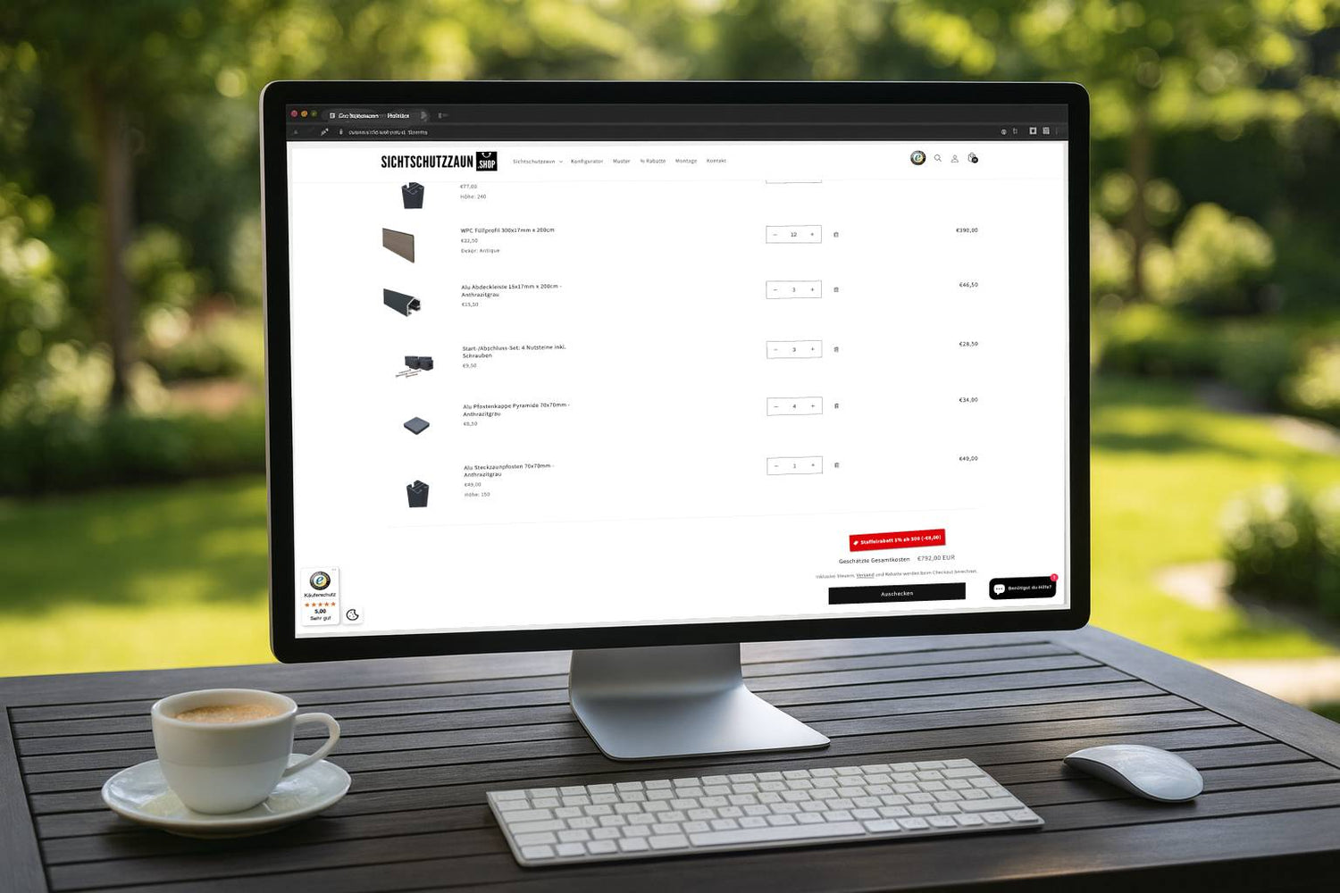 Während Du Deinen Sichtschutzzaun planst, aktualisieren sich alle Preise und Mengen automatisch in Echtzeit. Du siehst auf einen Blick: